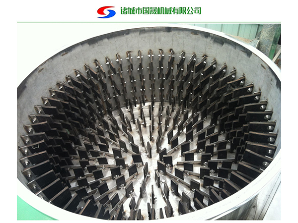 該機(jī)用于豬蹄、豬耳、豬鼻等去毛后的去黃皮、黑皮的工作和去除附著在表面余毛雜物等工作。本機(jī)通過減速機(jī)帶動甩盤轉(zhuǎn)動,使物料在筒內(nèi)高速旋轉(zhuǎn)碰撞、摩擦,從而實現(xiàn)脫黑皮和打毛的要求。
